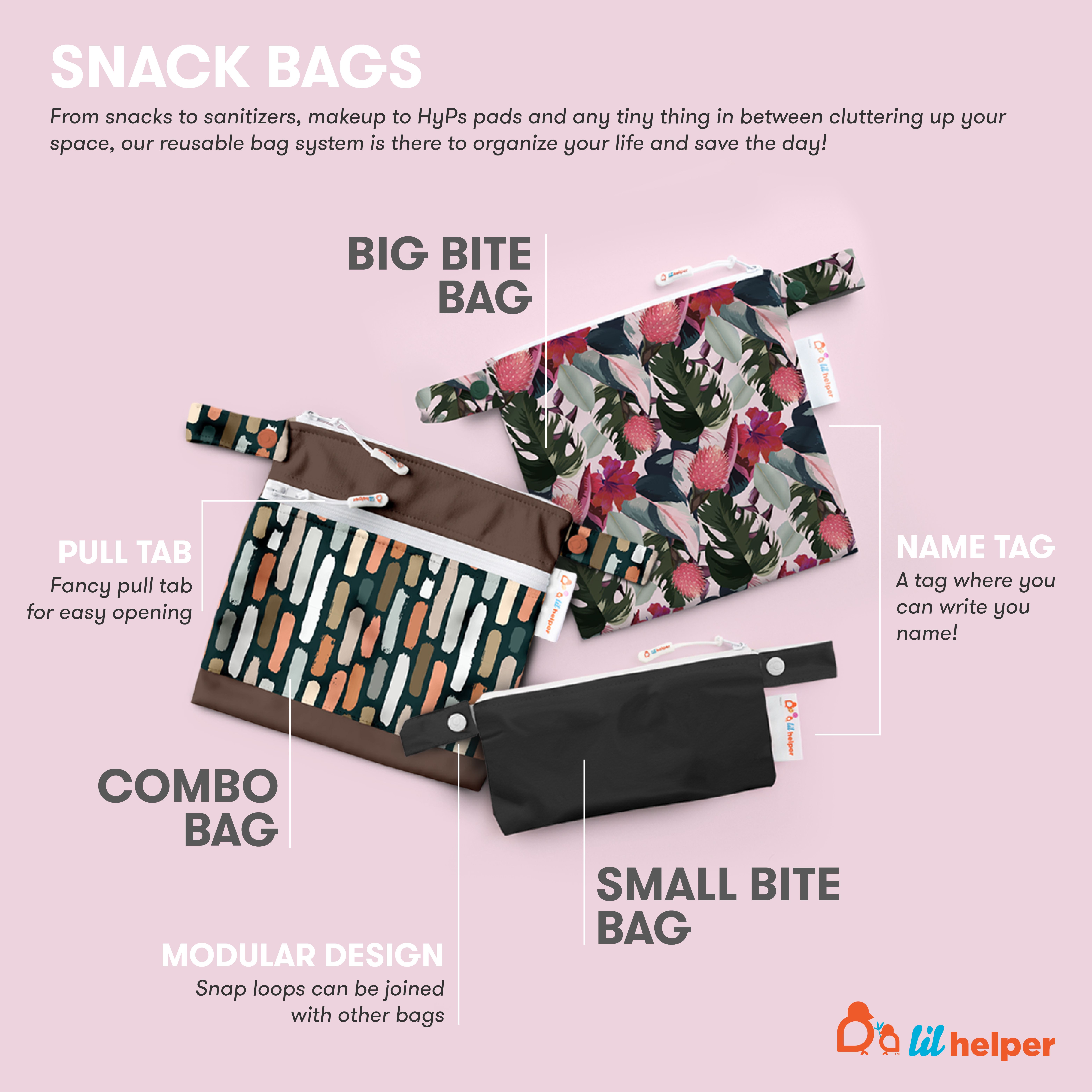 Both are washable, leak-resistant, and ready for snacks, travel, or anything else you toss their way. Choose your size—then snack happy!